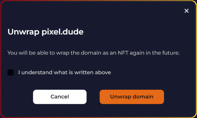 If you click on any of the Wrap or Unwrap buttons a modal to change the state from and to an NFT appears depending on the domain's current state.