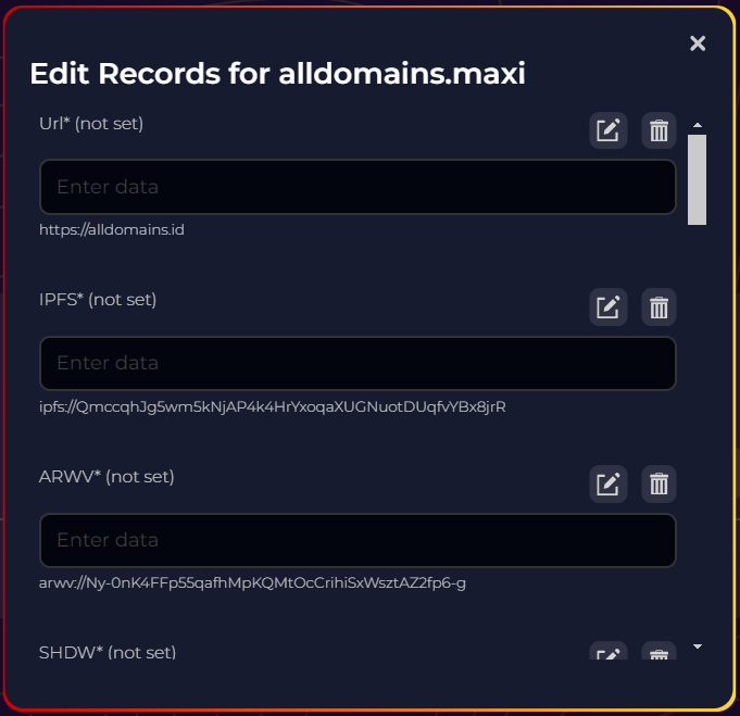 <figure><img src="https://4163218443-files.gitbook.io/~/files/v0/b/gitbook-x-prod.appspot.com/o/spaces%2FW79USbvVh7YhdsI3PhOO%2Fuploads%2Fgk2A7DQcK4jKc6ftsdYz%2Fimage.png?alt=media&#x26;token=19efedb2-7339-4d44-9a5b-eb9e3c626c72" alt=""><figcaption><p>Edit Domain Records</p></figcaption></figure>